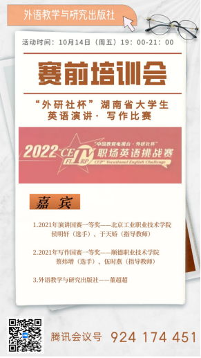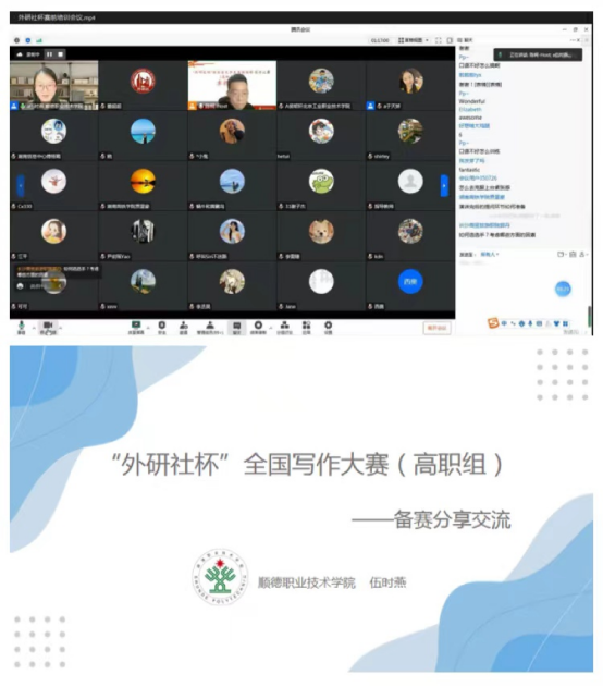 10月14日晚上7:00,由外语教学与研究出版社举办的2022年“外研社杯”湖南省大学生英语演讲▪写作比赛赛前培训会在线上举行。2021年写作国赛一等奖选手蔡炜增同学和指导教师伍时燕老师代表顺德职业技术学院作为嘉宾参加了此次赛前培训会。