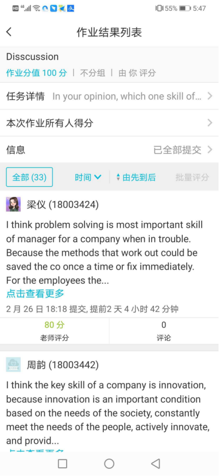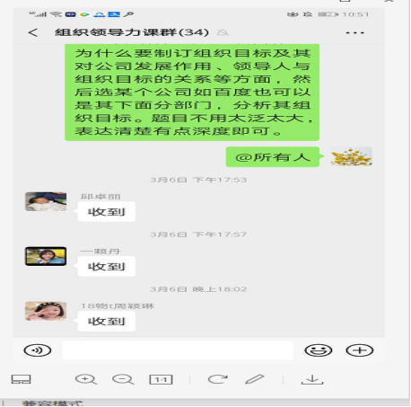新冠肺炎病毒春节过后在中国大地上迅速肆虐,周老师积极响应学校号召,在家采用线上直播、发布线上作业、线上签到、云盘发布学习资料、在线批改作业等方式进行网络教学。这学期她教授的课程包括《资源与人才规划》、《LCCI商务英语2》、《人员绩效管理》3门合作办学专业双语课程。为了保证网络教学的质量,周老师进行网络教学热情非常高,课后也受到同学们的一致认可,同时同学们也表现出了高度配合的态度。线上直播主要方式为钉钉直播,每次直播完之后会通过云班课APP发布相关作业让同学们加深印象并且周老师会进行线上评分,有疑问的同学周老师会对其进行线上答疑。另外课前会要求同学们在钉钉软件上进行签到,同学所需学习资料也在课程开始之前通过百度云盘进行共享。