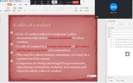 胡老师教授的课程是澳洲TAFE物流管理专业六级课程——《Leadership Across the Organisation》(组织领导力),主要通过oCam录制课件,并将授课PPT等相关学习资源上传到慕课平台,学生通过网络链接获取资源自主安排时间学习。