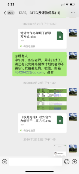 二是及时部署,保证教学效果。对外合作办学从抓教学、活课程、管服务、畅渠道等方面,有针对性地落实教学的具体要求,建立定点挂钩、检查指导的工作机制。第一时间建立了2019-2020年第二学期的授课教师微信群和班干部专班联络群,在网络教学正式开始前一周向学生公布所有课程的授课计划,提前一周补充完善网络教学资源及教学指引并发给学生,及时督促同学们积极主动地学习,保证教学效果。