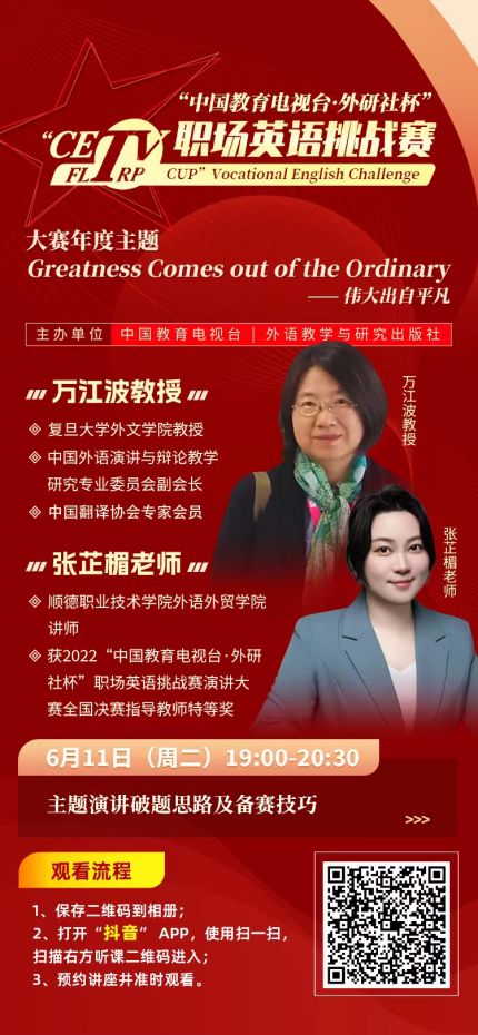 6月11日,由“中国教育电视台·外研社杯”主办的职场英语挑战赛系列破题讲座《主题演讲破题思路及备赛技巧讲座》在云端成功举办。本次活动通过“育见新闻”抖音号及“外研职教”微信视频号双平台直播,吸引了逾6000人次线上观看。