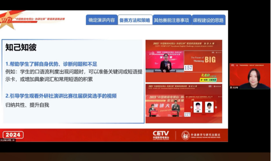 张芷楣老师从演讲内容、备赛方法、注意事项和课程建设四个方面分享了经验。她表示,应优先考虑从学生的熟知领域选取演讲素材,在备赛过程中,要做到知己知彼,运用恰当高效的语言能力训练方法,提升演讲语言的表达质量。此外,还介绍了如何在课程建设中通过赛教融合实践,高效赋能英语教学和人才培养,切实提升学生的语言能力和职业素养。这些都是她在指导全国演讲大赛冠军的过程中积累的宝贵经验。