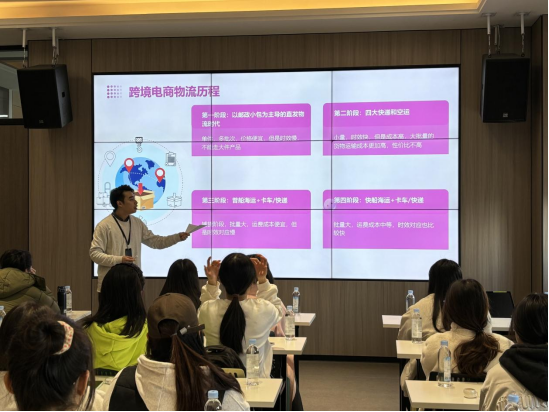 此次企业见习,师生们受到了企业的热烈欢迎。首先由广东领运物流有限公司李梓豪经理为大家做关于跨境电商海运头程方向的专题分享。同学们从李经理的分享中学习到了跨境电商物流发展历程,如同一部物流行业的进化史。从邮政小包的直发物流,到四大快递专线物流,再到普船海运与卡车/快递,直至快船海运与卡车/快递的结合,每个阶段都是行业对成本和时效不断优化的见证。同时,同学们明白了跨境电商物流流程和风险把控是行业的核心竞争力。从询盘订舱、量数据、报关等国内环节,到开船、清关、海外仓操作等国外环节,流程复杂而严谨。领运物流在风险把控方面展现了其专业团队和丰富经验,为货物运输中的丢失损坏风险以及清关时的政策风险提供了成熟的应对体系。